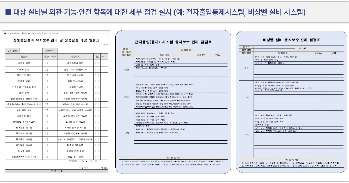 ① 설비의 외관, 기능 및 안전 상태를 매년 주기 점검 ② 점검결과를 정보통신설비 유지보수·관리 점검표에 기록 |